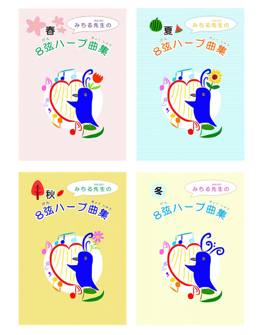 知っている曲を集めました!8弦ハープで弾けるテキスト4冊!テキストの詳細は→こちら