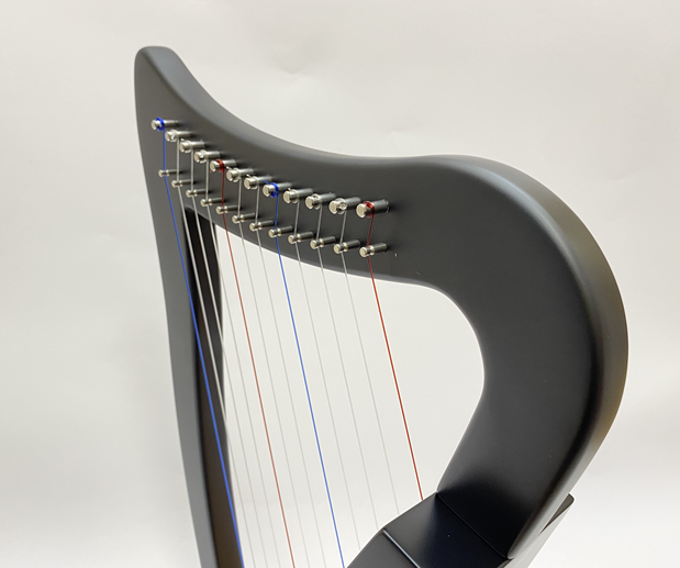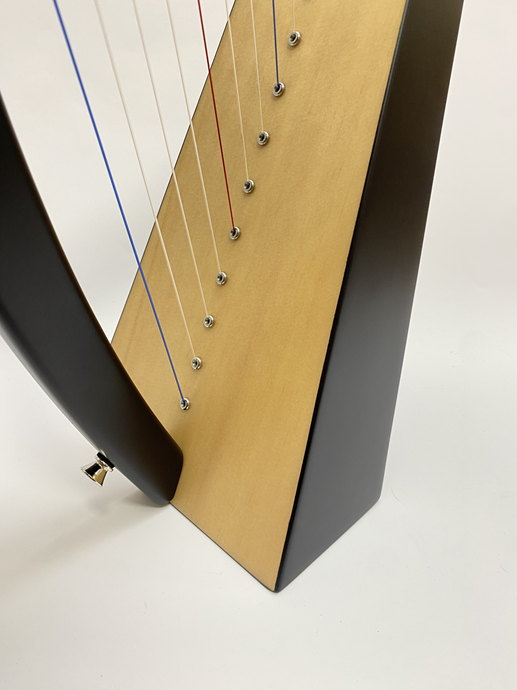 ブラックボディにナチュラルカラーの共鳴板の組み合わせが美しいハープです。