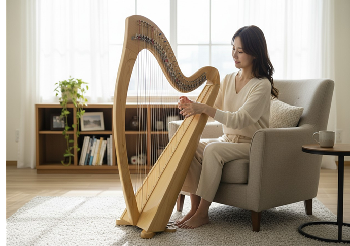 なかなか高さや目線の位置がわからず、どうやって合わせるか悩んでいたのですがお店で相談し、自分の身長や目線の高さに合ったハープを見つけることが出来て良かったです。試奏に行かなかったらわからなかったので色々教えていただき感謝です。そして36弦でこの高級感と安さのハープは他でなかなか買えないハープだと思います。 - GGと一緒に!始まるハープライフ!